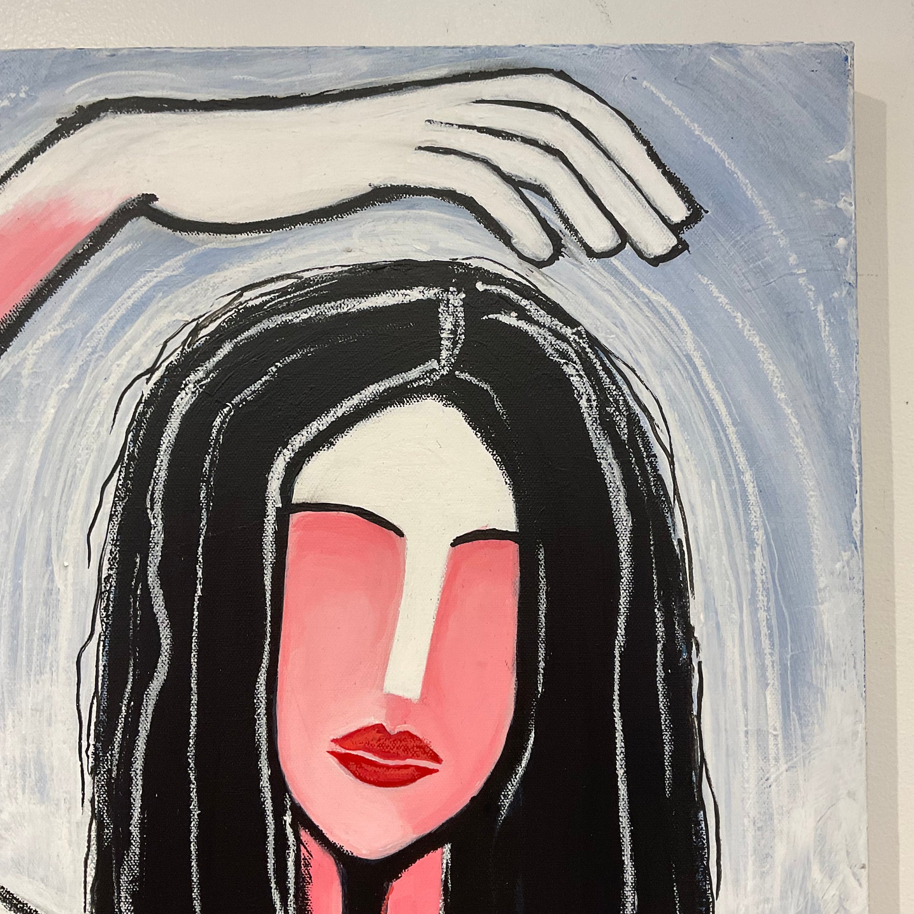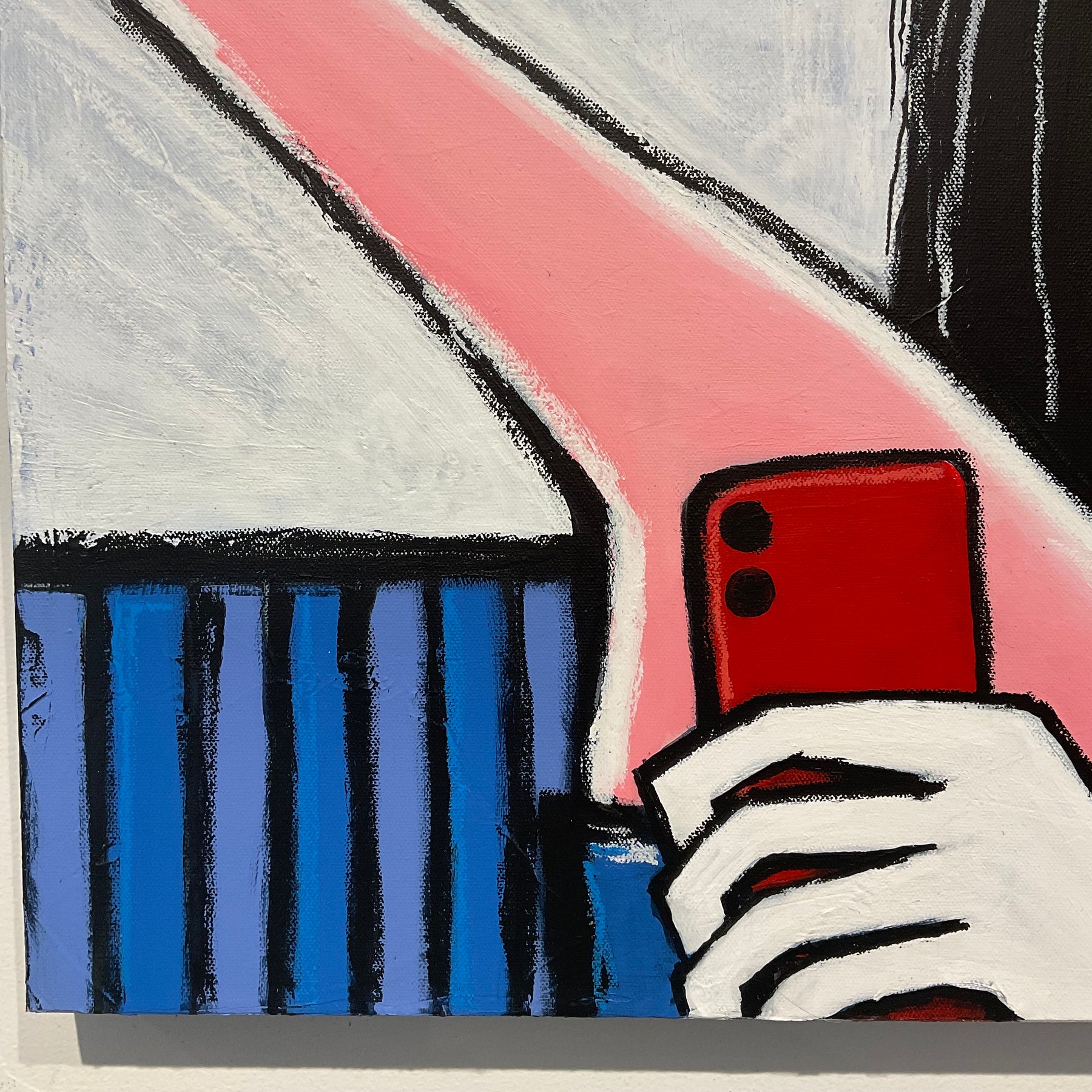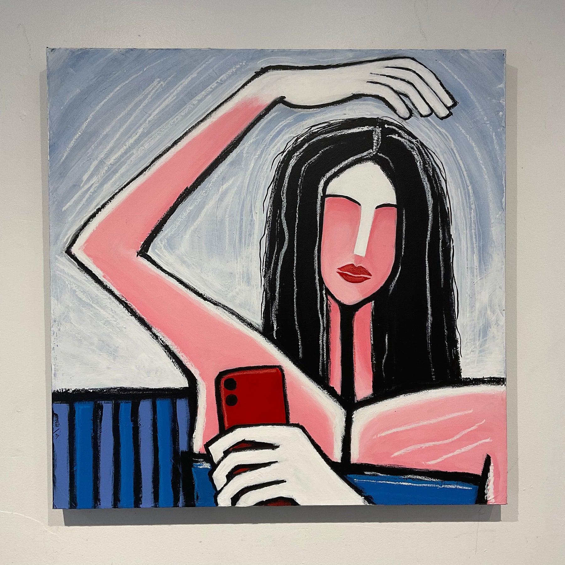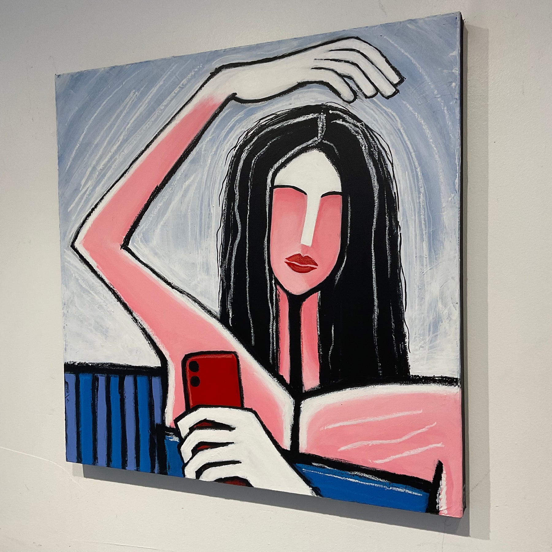 This striking contemporary piece captures the zeitgeist of the digital age through a bold, neo-expressionist lens. The painting features a stylized female figure engaging in the modern ritual of the "selfie," rendered with thick, confident black outlines and blocks of vibrant color. The angular, elongated pink arm creates a dynamic frame around the subject's face, while the stark contrast between the deep red smartphone and the cool, textured blue-grey background draws the eye immediately to the act of capture. A playful yet poignant exploration of identity and self-presentation.