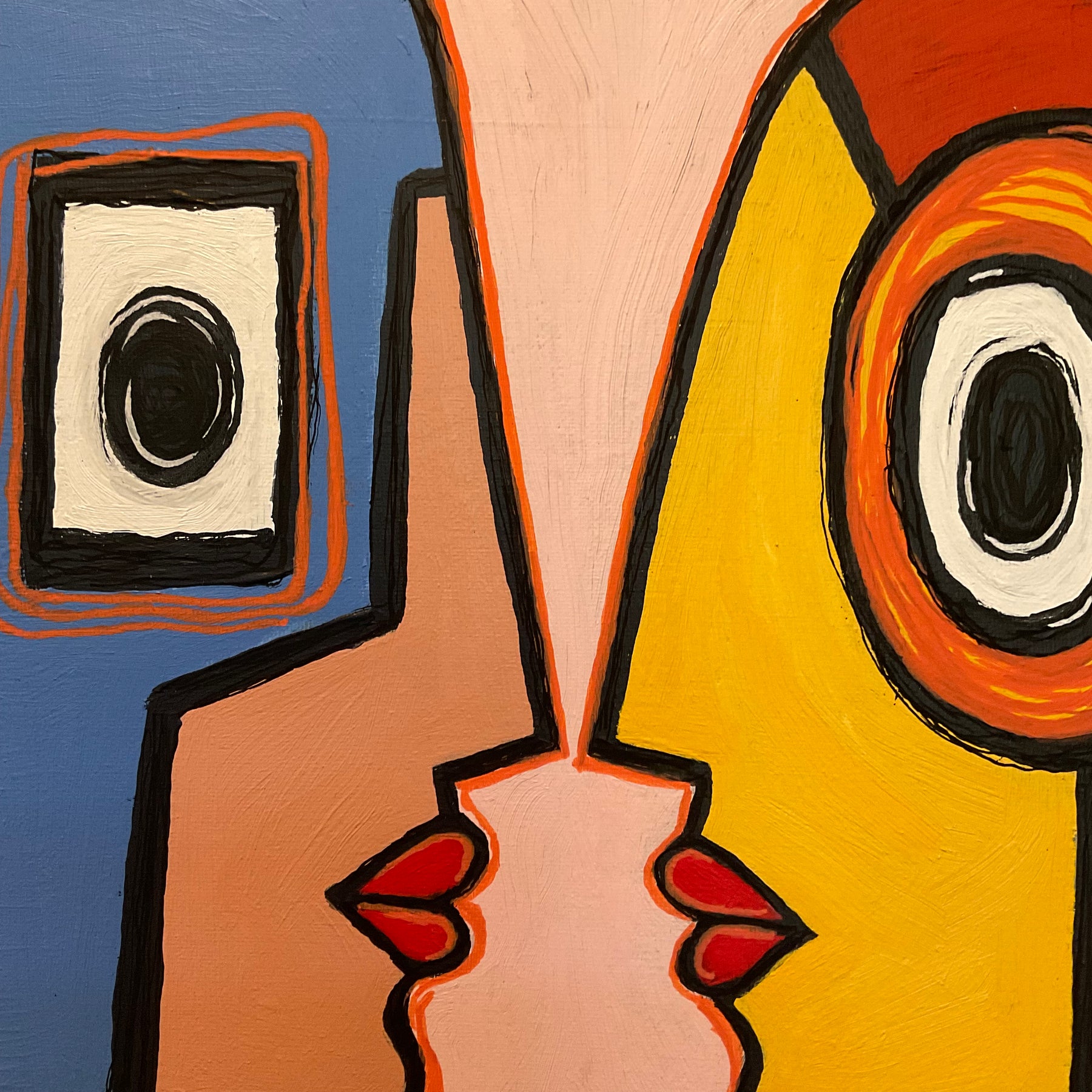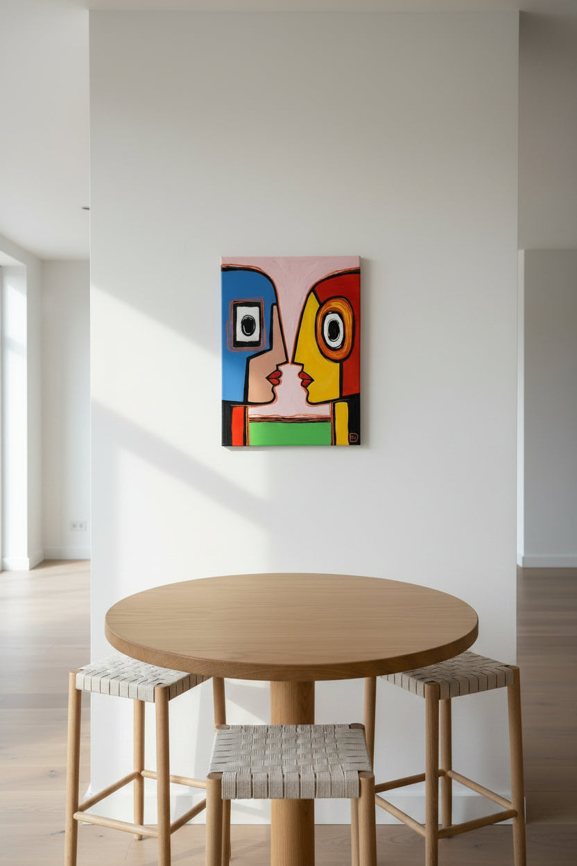 "Welcome My Friend" is a striking exploration of connection, intimacy, and the shared human experience. This 16" x 20" acrylic painting features two stylized profiles locked in a moment of silent greeting. The composition is balanced yet dynamic, utilizing a mirror-like symmetry that draws the viewer into the space between the two figures—a space filled with a soft, warm pink that suggests a bridge of mutual understanding.