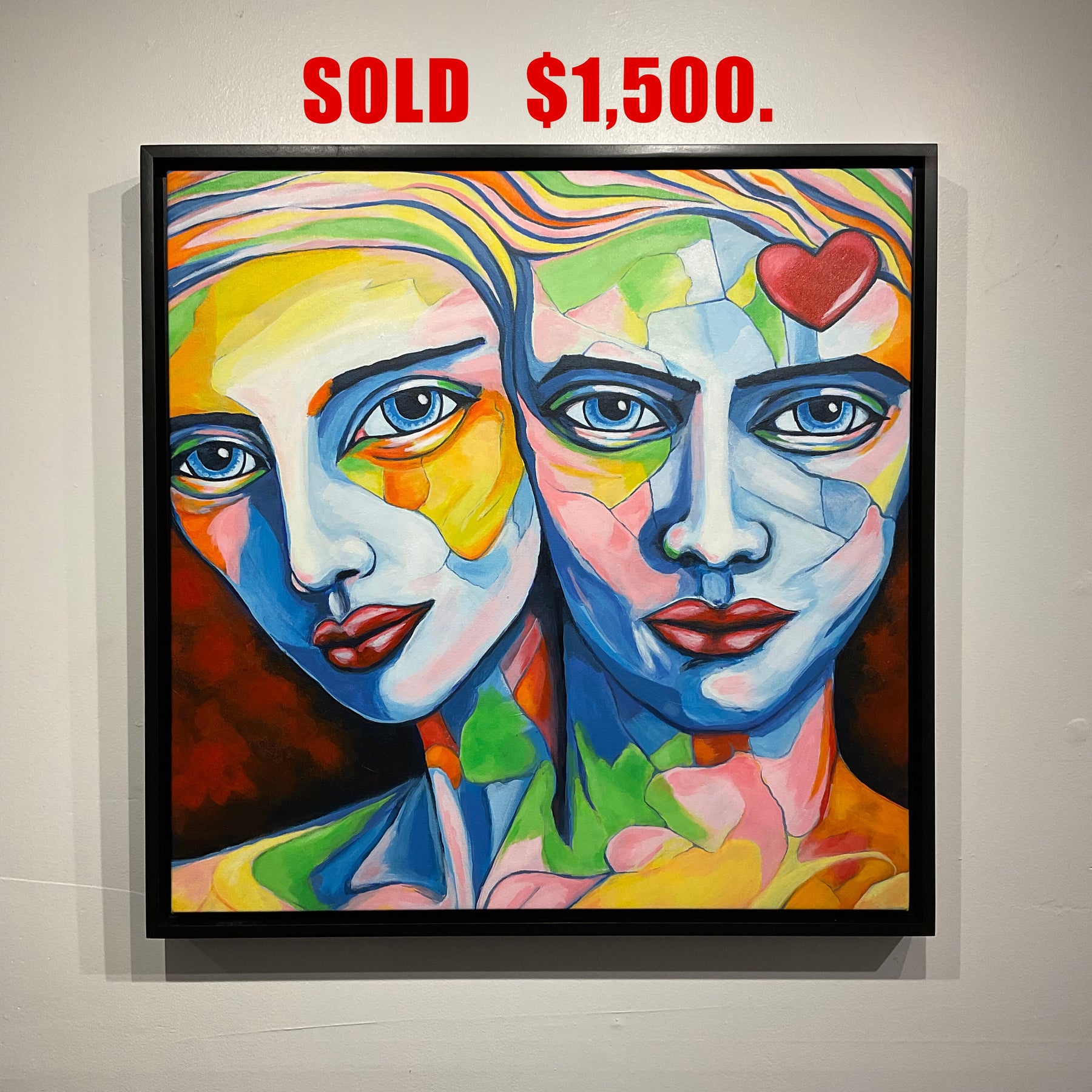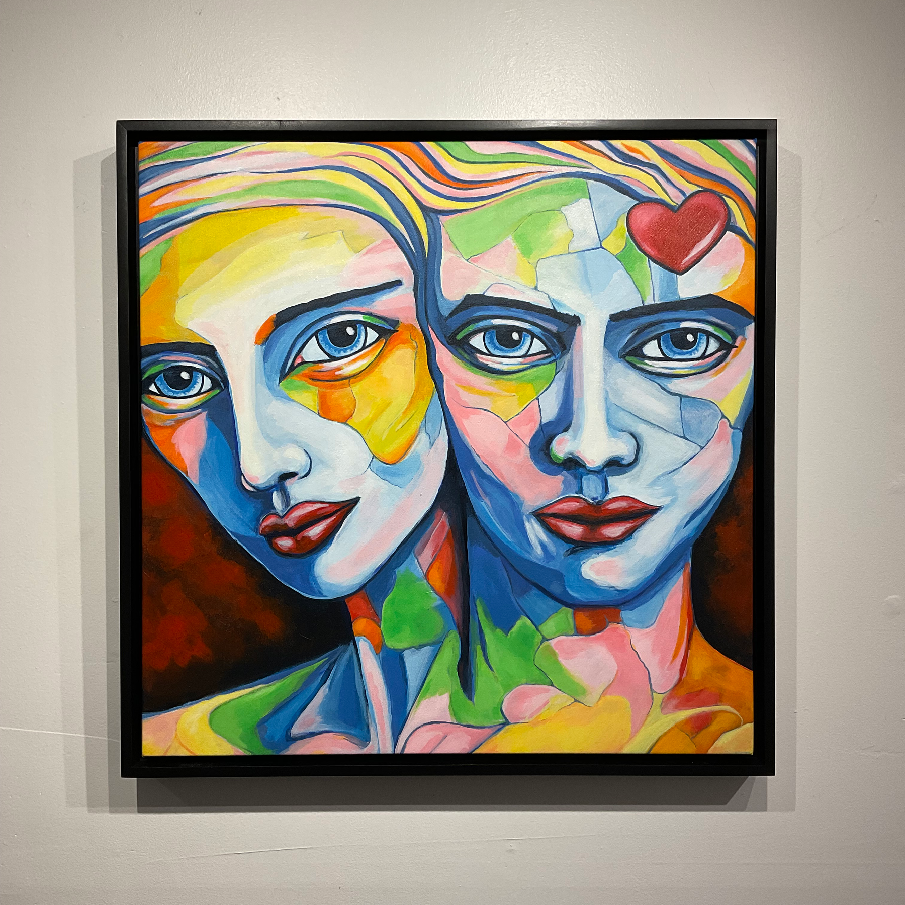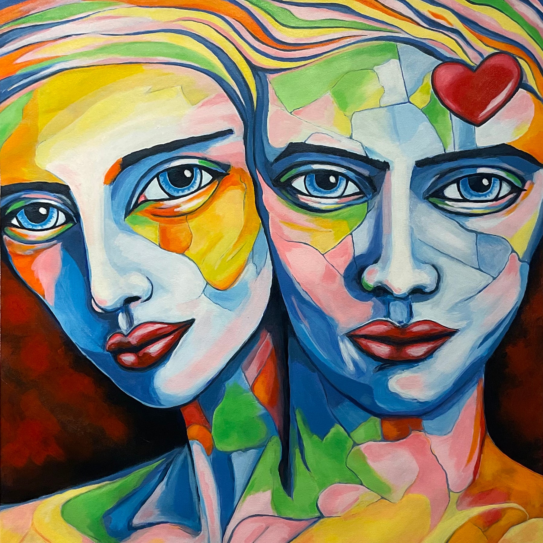 The title Fractured Love suggests that affection and connection are rarely simple or monolithic. By breaking the faces into distinct shards of color, the artist illustrates how two individuals might merge into one unit while still maintaining a complex internal architecture of different moods, histories, and perspectives. The 24" x 24" scale provides an intimate window into this psychological landscape, inviting the viewer to contemplate the beautiful, broken, and reconstructed nature of intimacy.